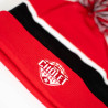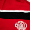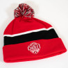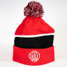Bonnet rouge avec une petite rayure blanche et une grande rayure noir er un pompon noir, blanc et rouge.