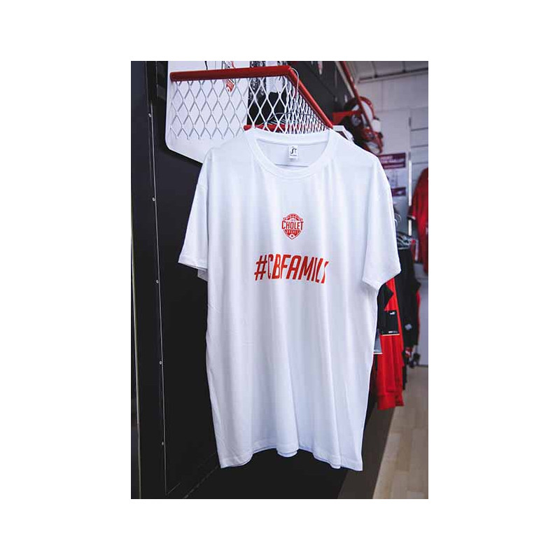 Tee-shirt blanc taille XL avec le logo de Cholet Basket et le texte "#CBFAMILY" en rouge au centre.